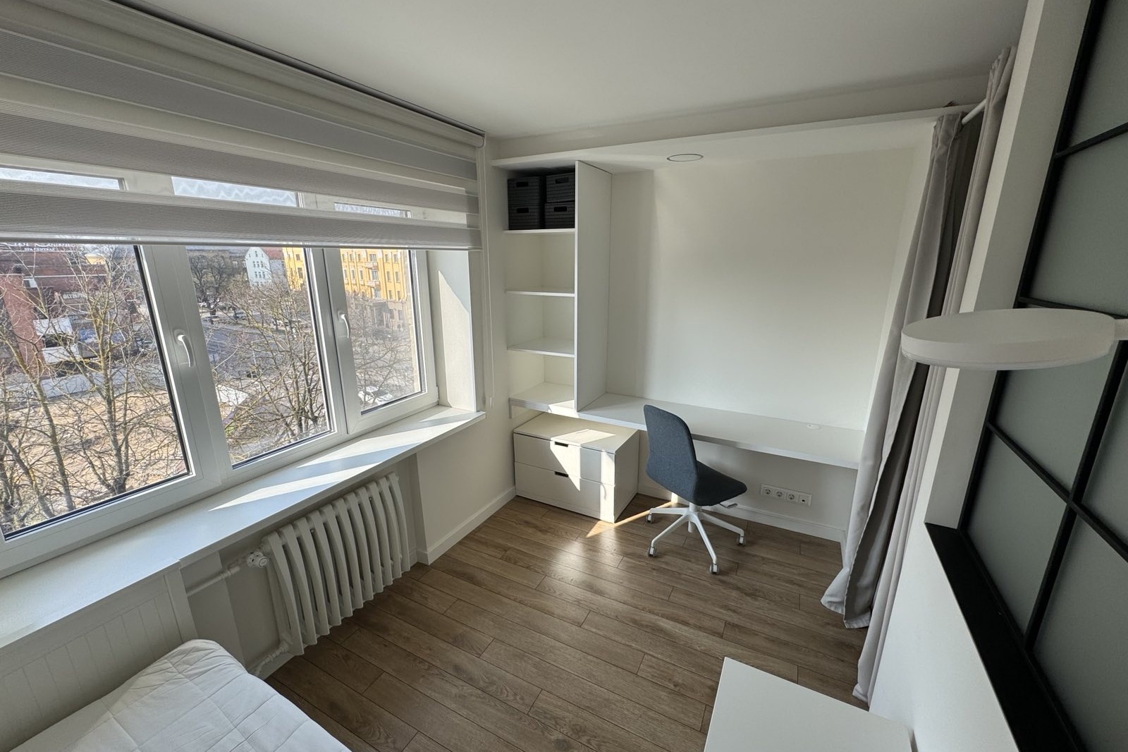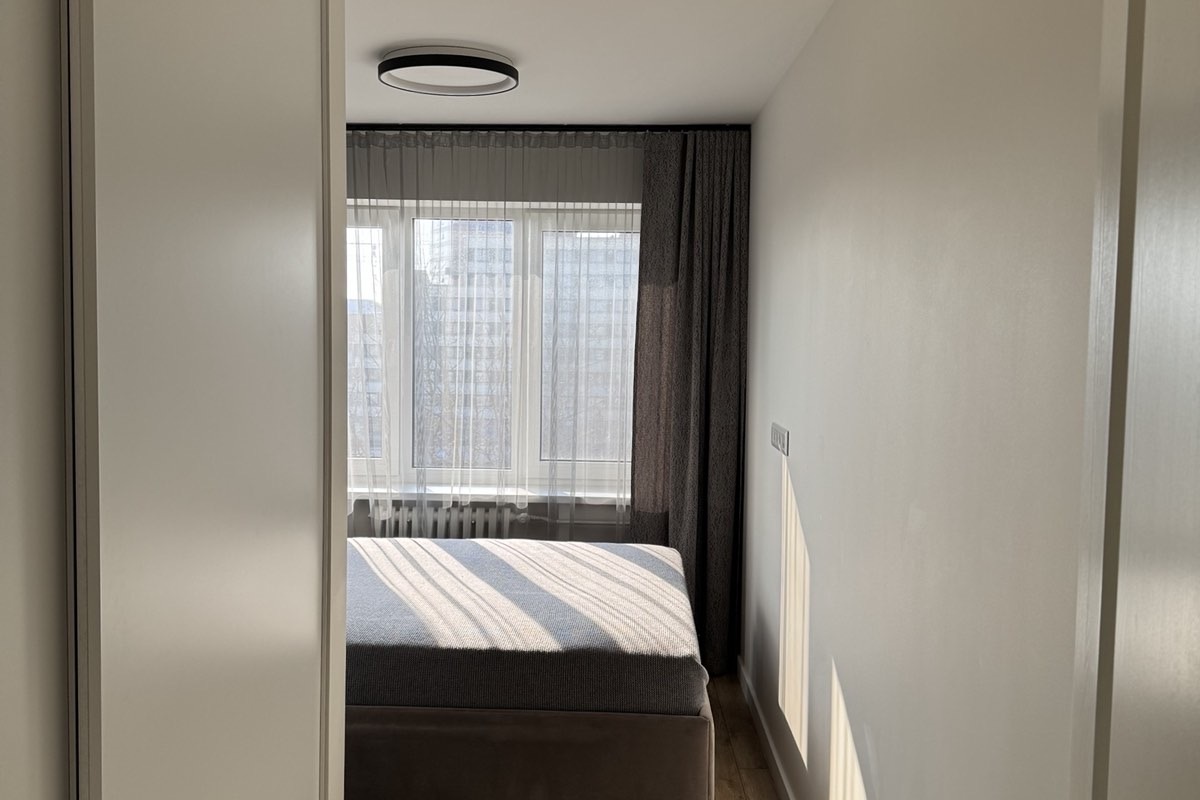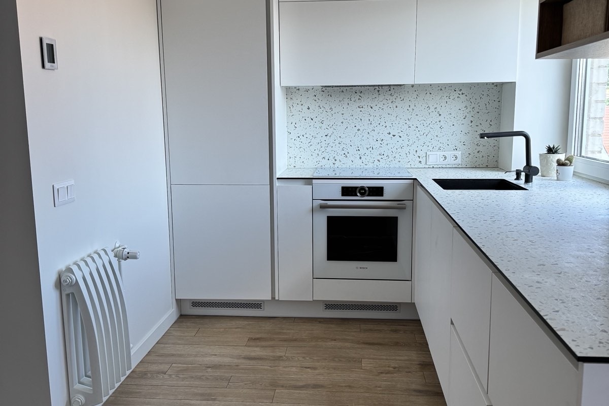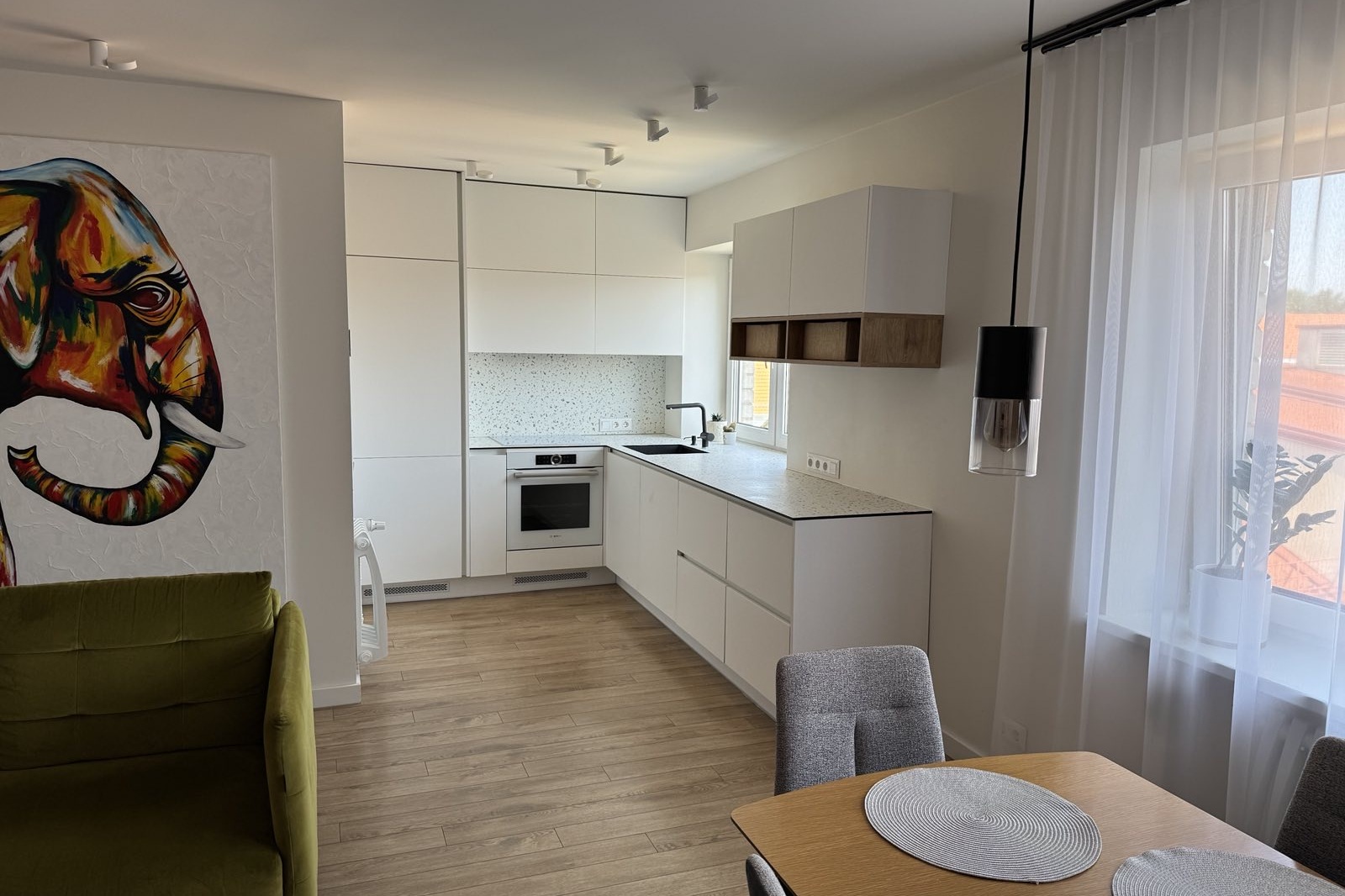 Svetainė sujungta su virtuve, vonia su WC kartu. Bute paliekami visi baldai ir Bosch buitinė technika.