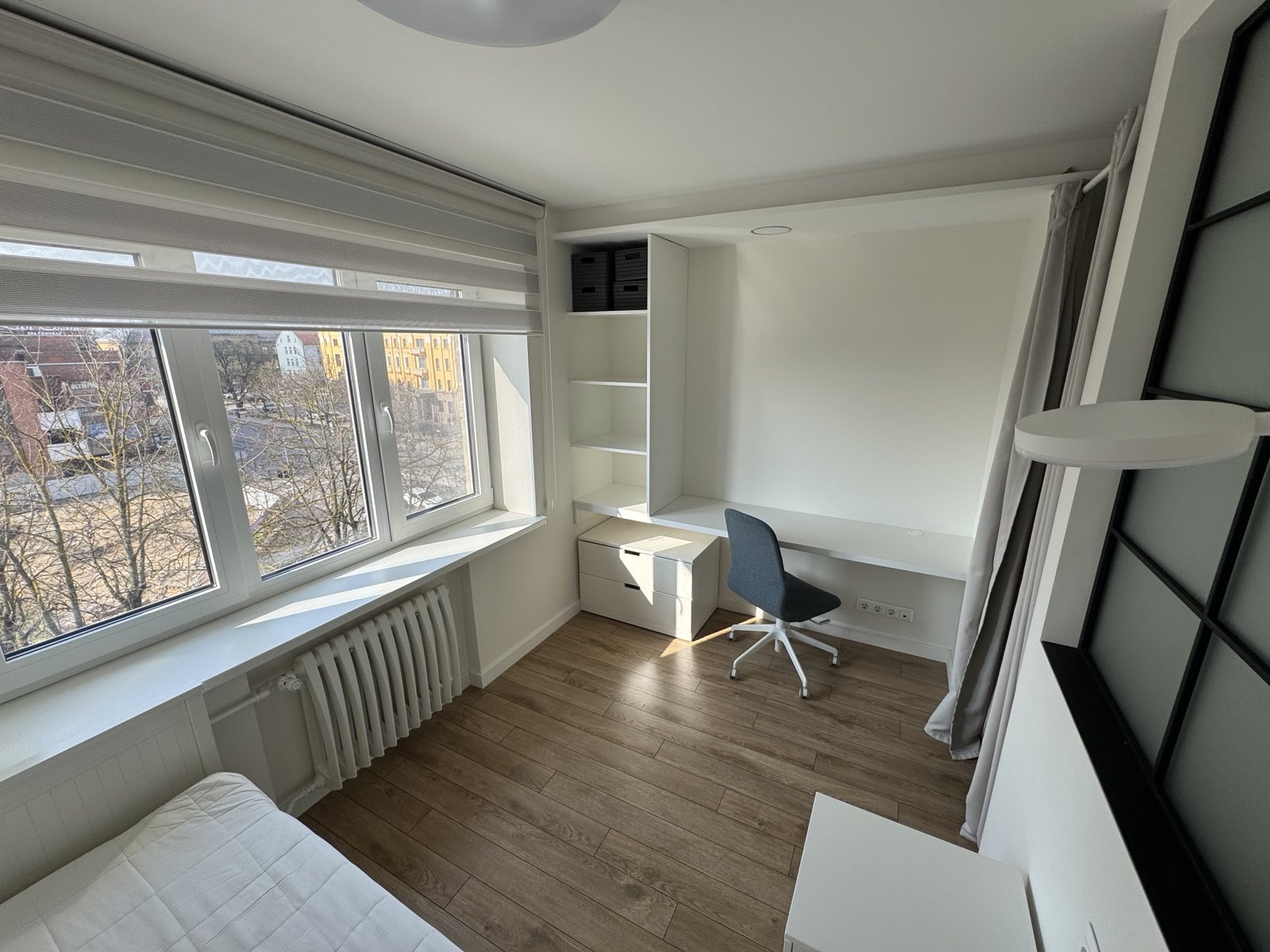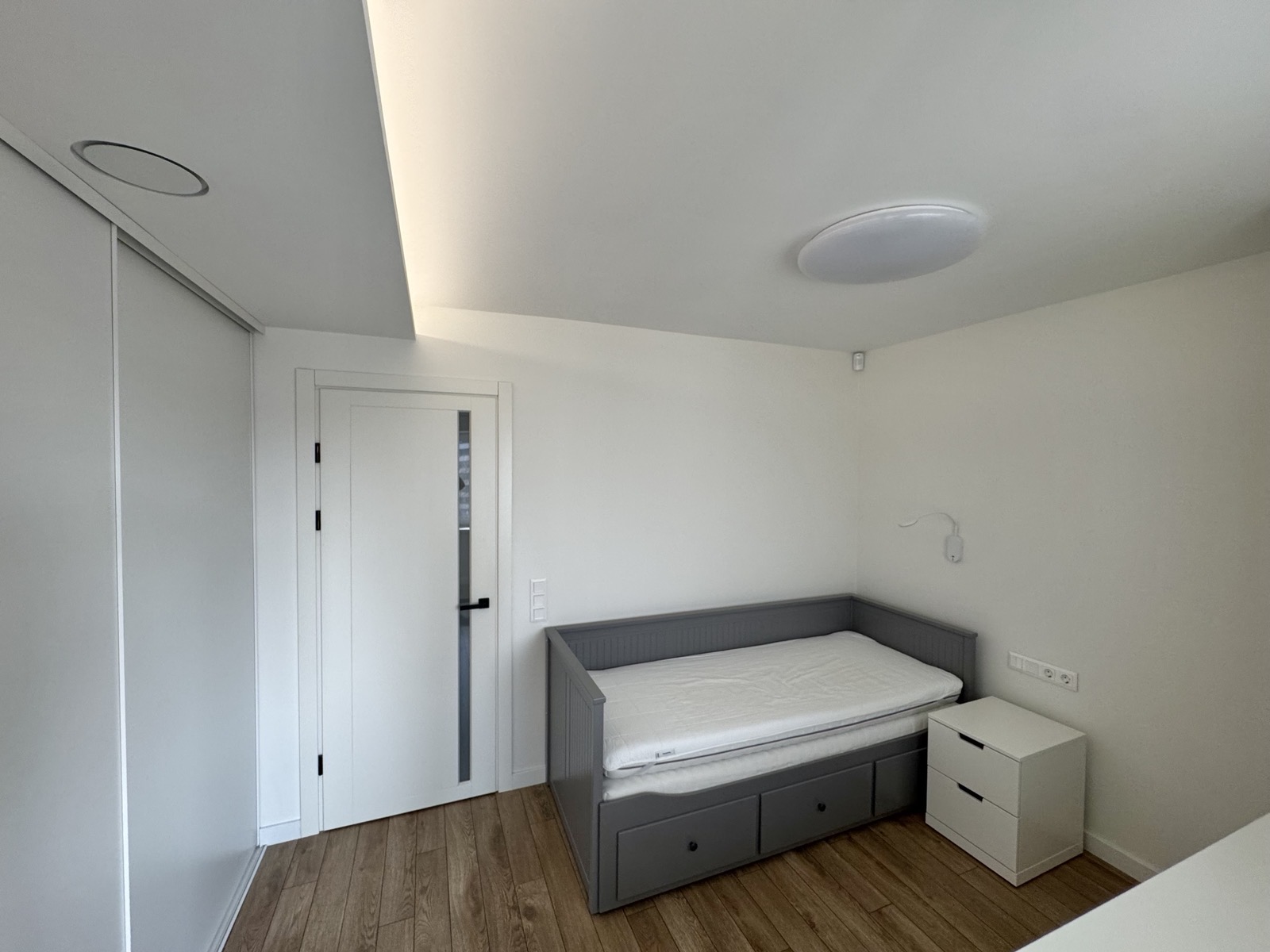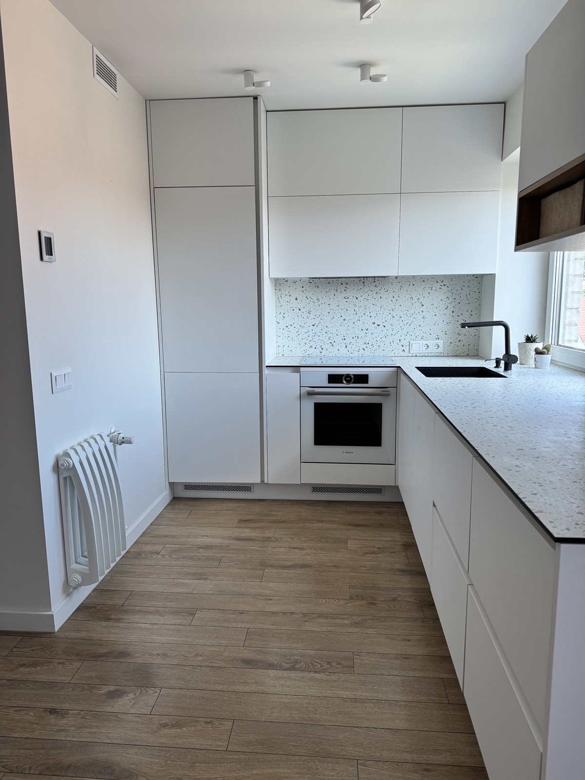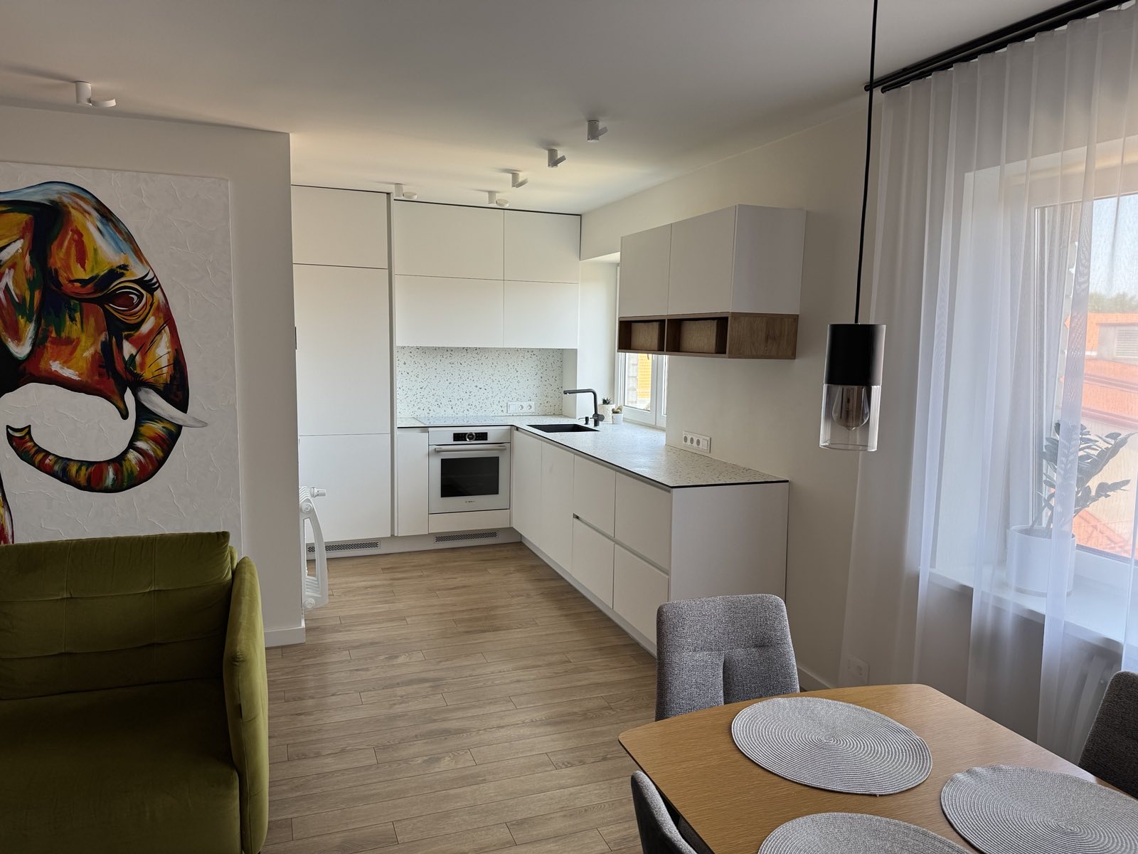 Svetainė sujungta su virtuve, vonia su WC kartu. Bute paliekami visi baldai ir Bosch buitinė technika.